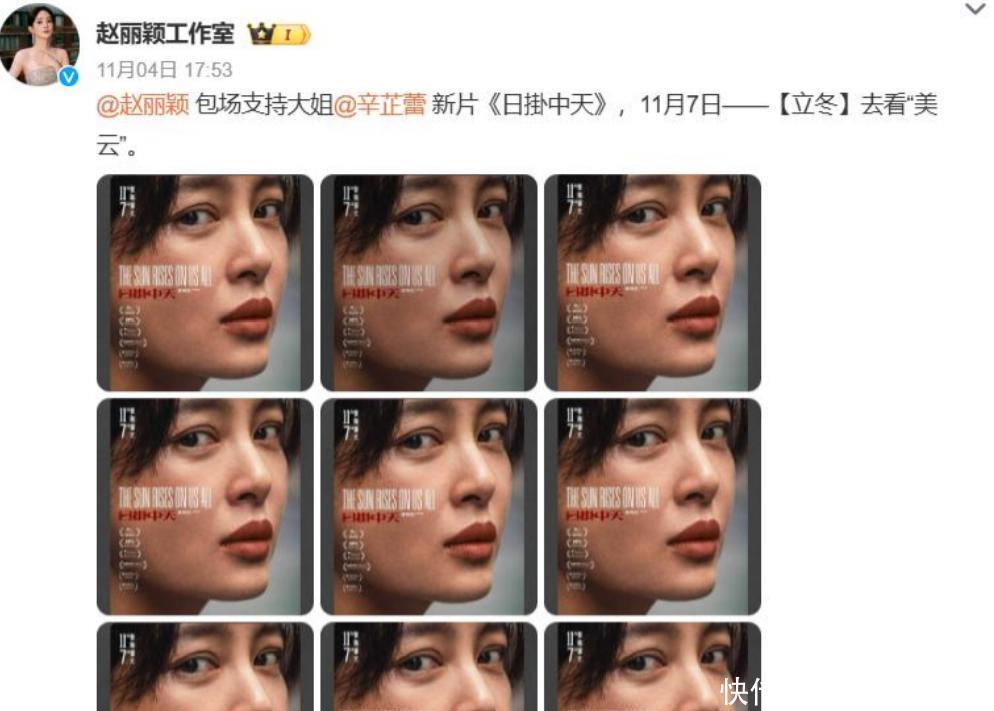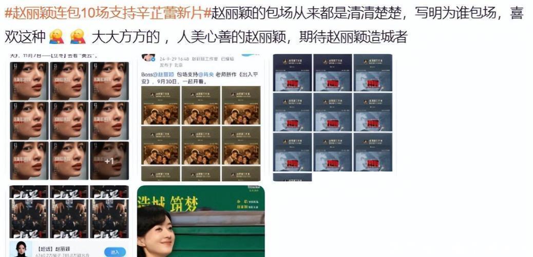 看来这对戏内的姐妹花感情早已延续到了戏外。本以为赵丽颖在此之后不会有更多的动作。但是在11月4日,赵丽颖突然甩出了一个王炸。因为辛芷蕾的获奖片《日褂中天》即将上映,所以她干脆来了个包场。整整十场黄金场次的包场,范围涵盖了很多超一线城市。