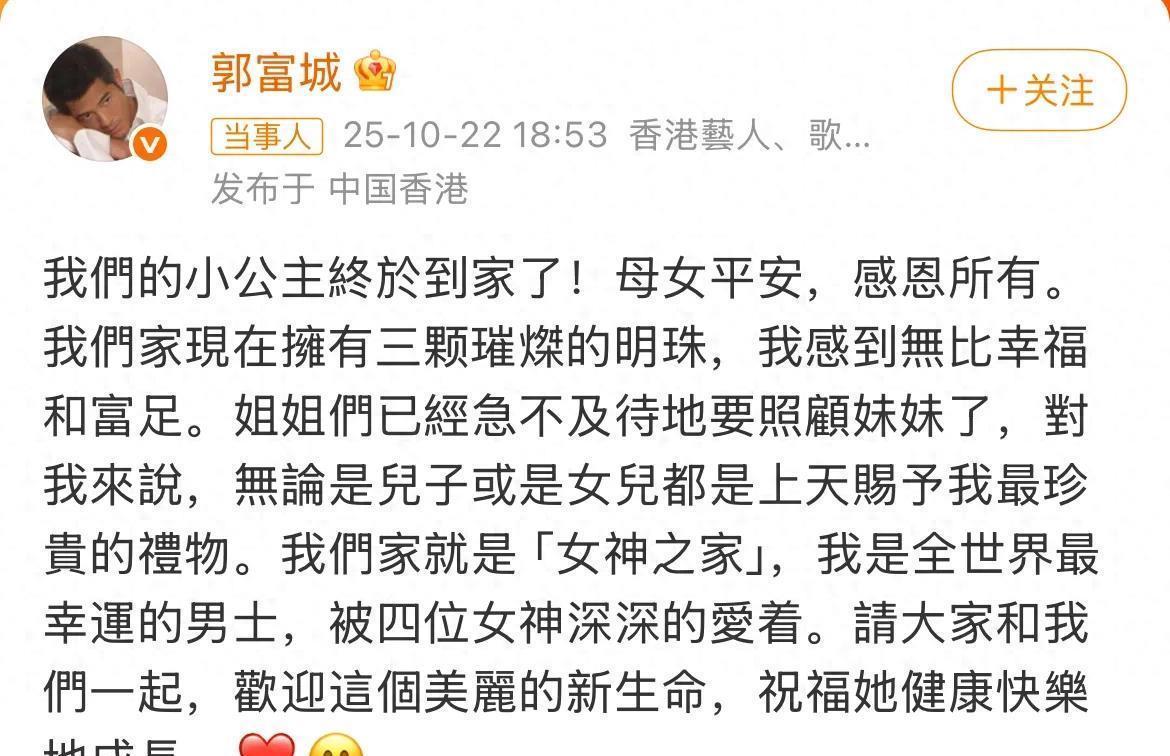 自从郭富城官宣以来,大众真的特别关心郭富城到底是生儿生女,毕竟这关乎着香港的四大天王,因为目前生的都是女儿中间有过各种争论,还有人说郭富城喜欢儿子,不过都没有证实郭富城官宣啦这一次,孩子真的生下来了,媒体也不同意盯着了,最重要的是郭富城自己开心就好,在自己的社交平台,发了很长的一段文字生怕别人误会他喜欢儿子,还送了一张孩子的照片,